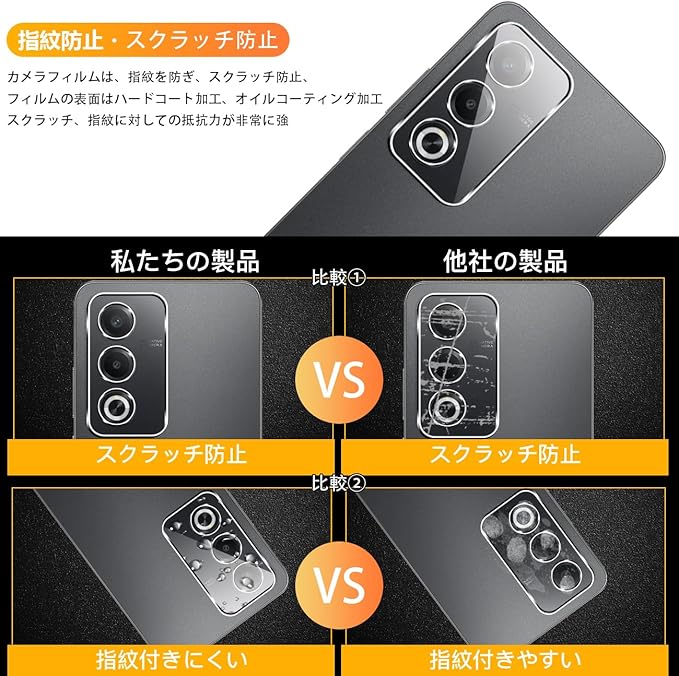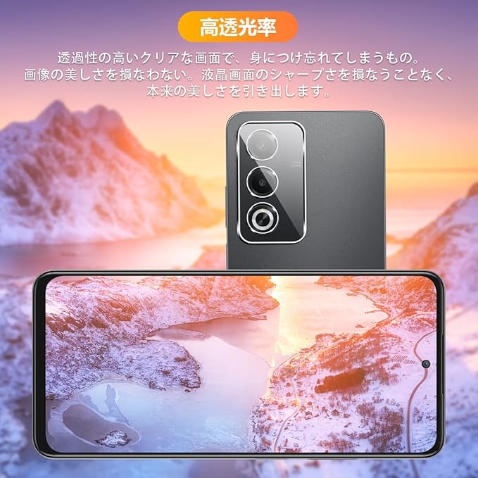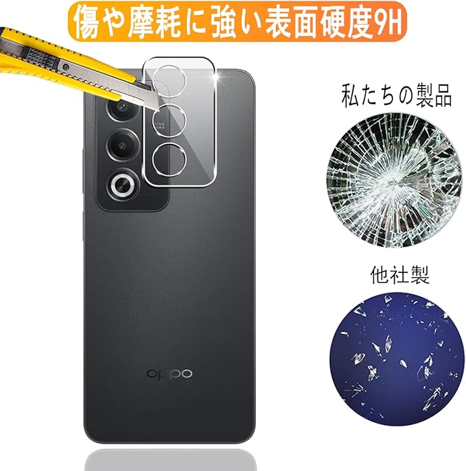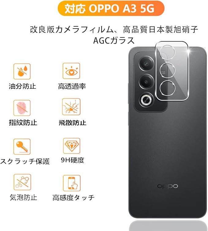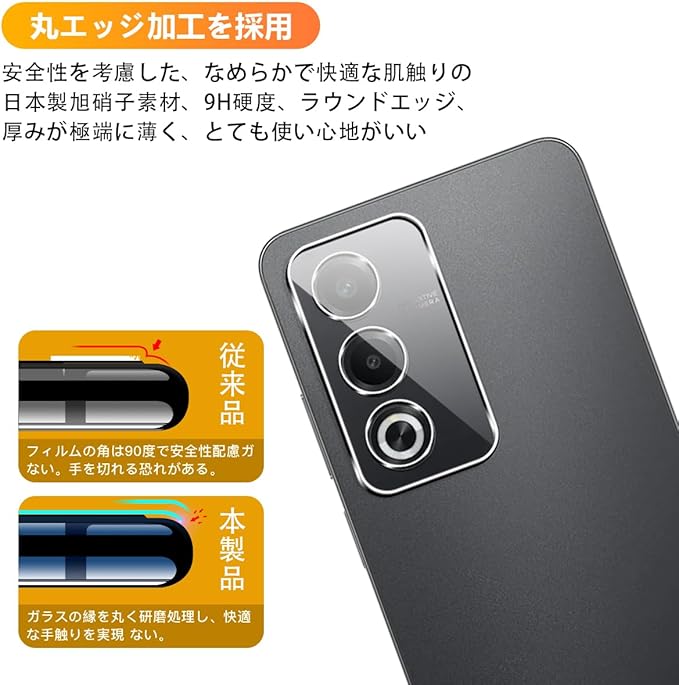 【9H強度&飛散防止】対応 OPPO A3 5G レンズ 強化ガラス 保護フィルムは日本旭硝子素材を採用します。 落下、スクラッチ、衝突、衝撃に高い耐久性があります 衝撃を最小限に抑えてカメラの破損を抑え。カッターなどの鋭利なものを当