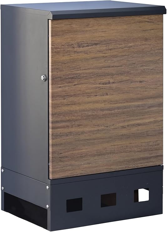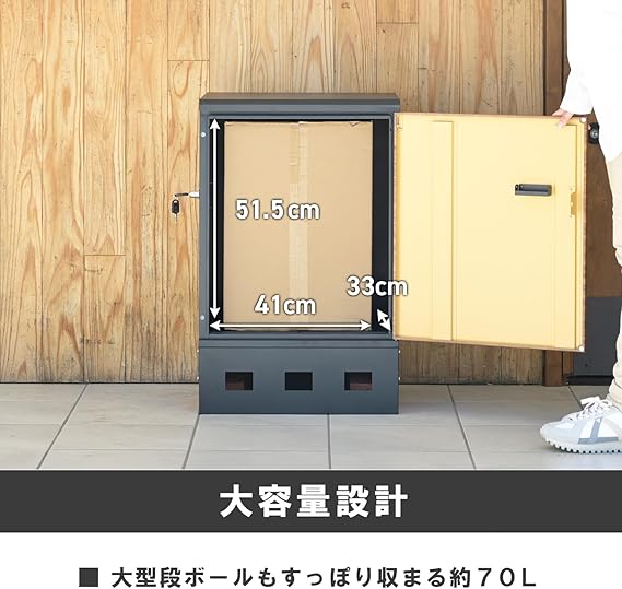 【仕様】本体サイズ:幅47×奥行36.5×高さ75cm/重量:約17.5kg/材質:金属(スチール)/付属品:ネジセット×12+1(予備)、セキュリティーワイヤーロック(ダイヤル式鍵付き)、印鑑置き、宅配業者様向けマグネット、鍵×2、プラスドライバー/カラー:木目・ブラック