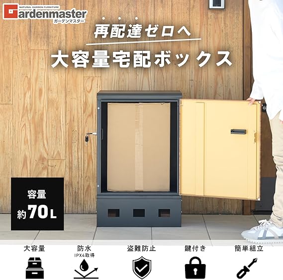 ガーデンマスター(Gardenmaster) 宅配ボックス 屋外 大容量 鍵付き 防水 戸建て用 郵便ポスト一体型 置き型 2Lペットボトル×6本収納可 防犯 簡単設置 盗難防止 木目・ブラック EPB-1(WD/BK) a