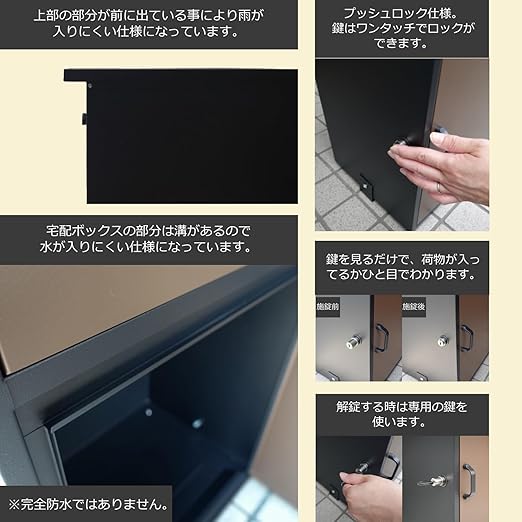 セキュリティ機能: 頑丈な鍵付きシステムを採用し、配達物を安全に保管