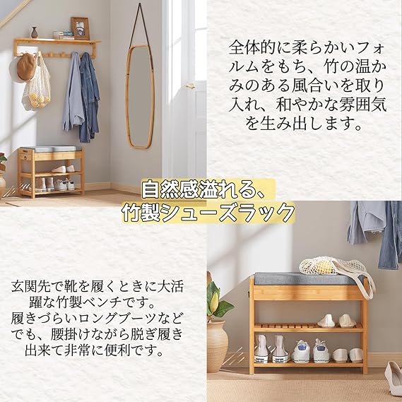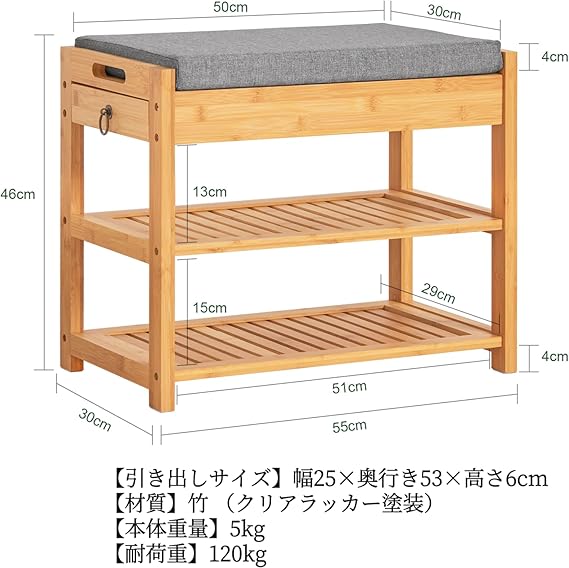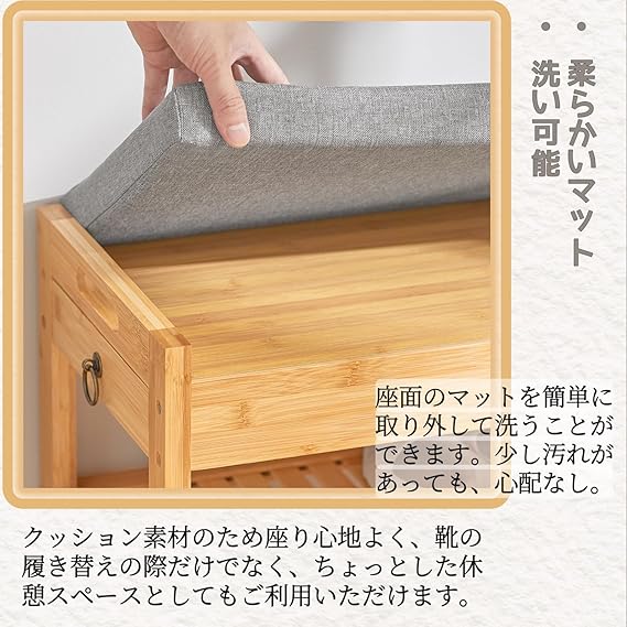 SoBuy 玄関ベンチ 玄関椅子 収納ベンチ 靴箱 3段式 竹製 幅55×奥行き30×高さ45cm 下駄箱 引き出し付き クッション洗い可能 シューズラック 玄関スツール シューズボックス 靴棚 靴収納 収納スツール (FSR49-N) a