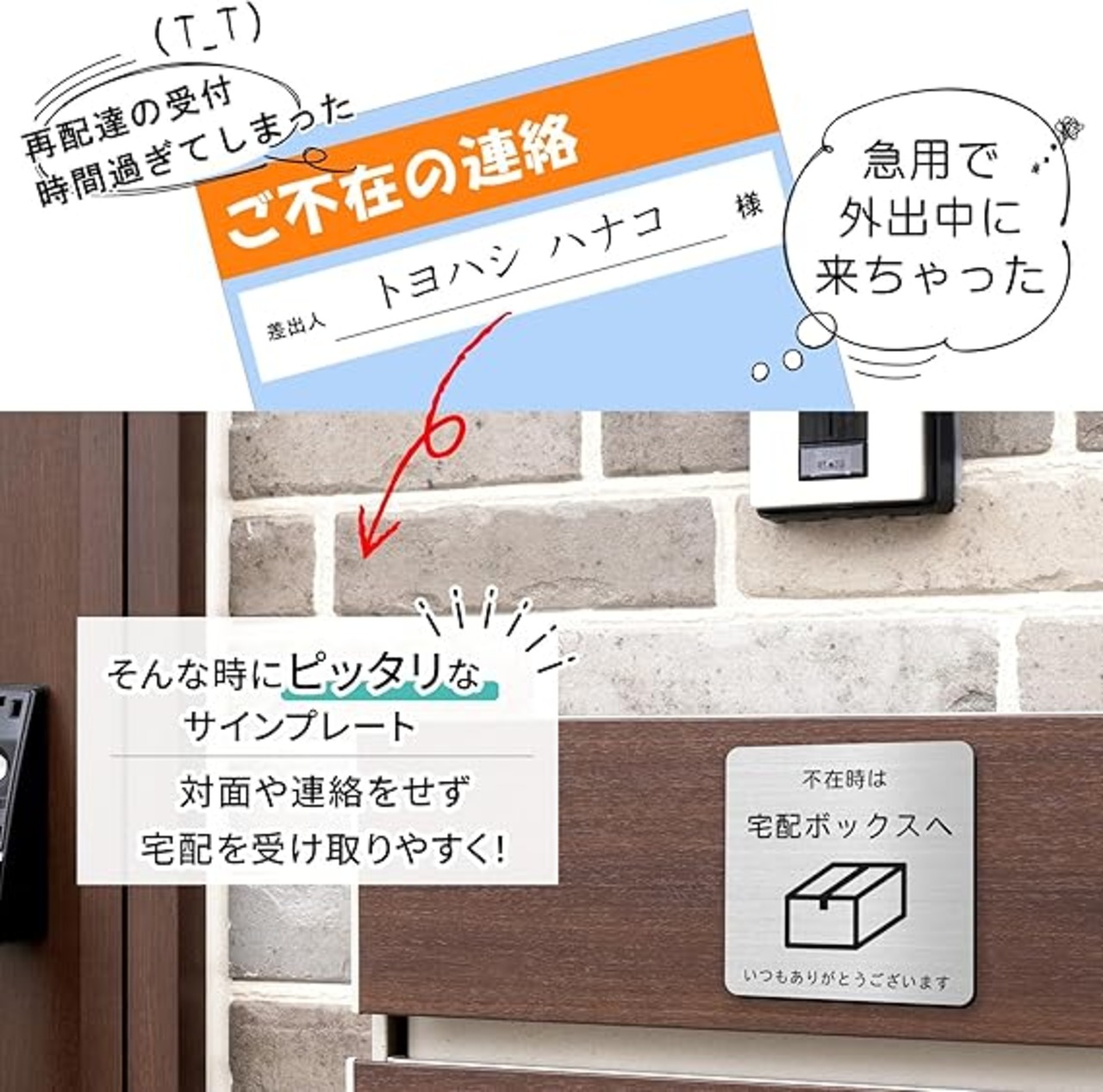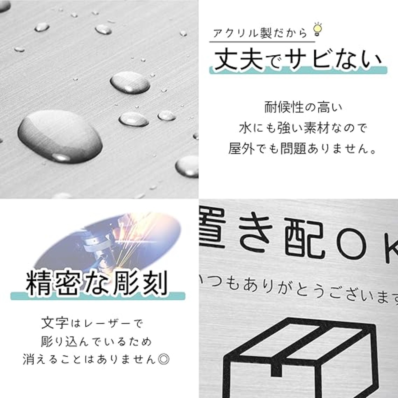 かたちラボ サインプレート 不在時は宅配ボックスへ 置き配OK シルバー ステンレス調 屋外OK 銀 シール式 日本製 a