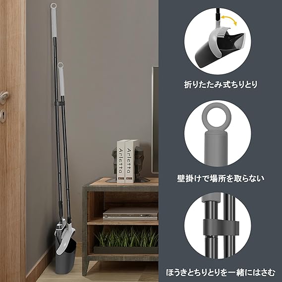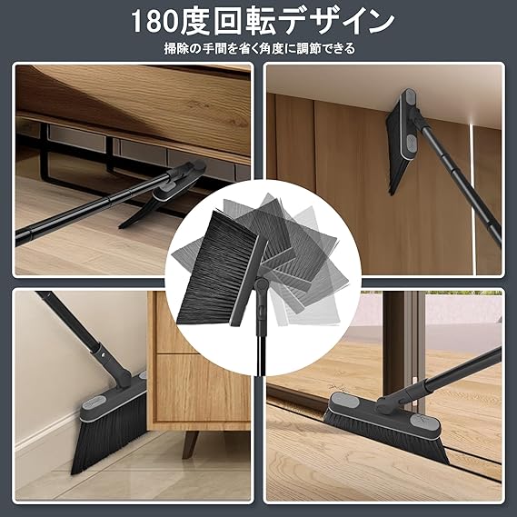 ほうき ちりとり:ほうきヘッドの2つのスナップは、窓拭き、モップ掛け、掃き掃除などの不織布と連動します。また、180度回転するヘッドで、ベッドやテーブルの下など、目隠しになる場所の掃除も簡単です。