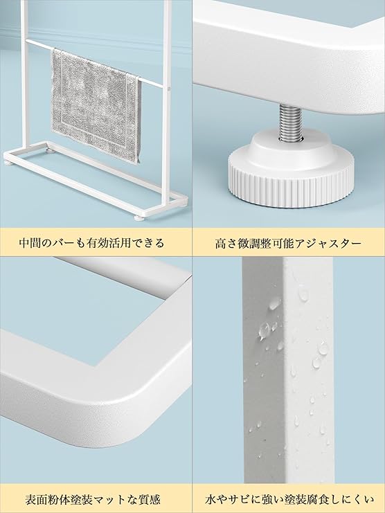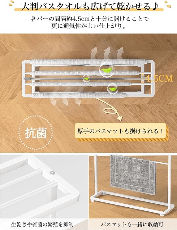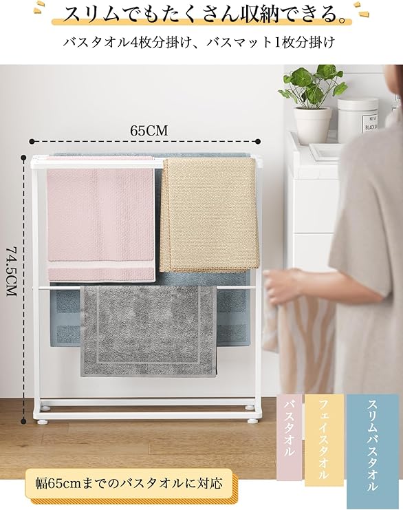 【2025年春 新版バスタオルハンガー】商品サイズ: 約幅65×奥行き18×高さ74.5cm。仕様変更奥行き18cmで、風通しのいい、除菌効果が期待できます。シンプルなデザインなので、ランドリースペースだけでなく、リビングや寝室でもサラリとなじみます。しっかりと重みのあるスチール製だから安定感も抜群です。
