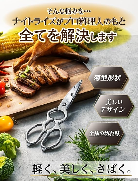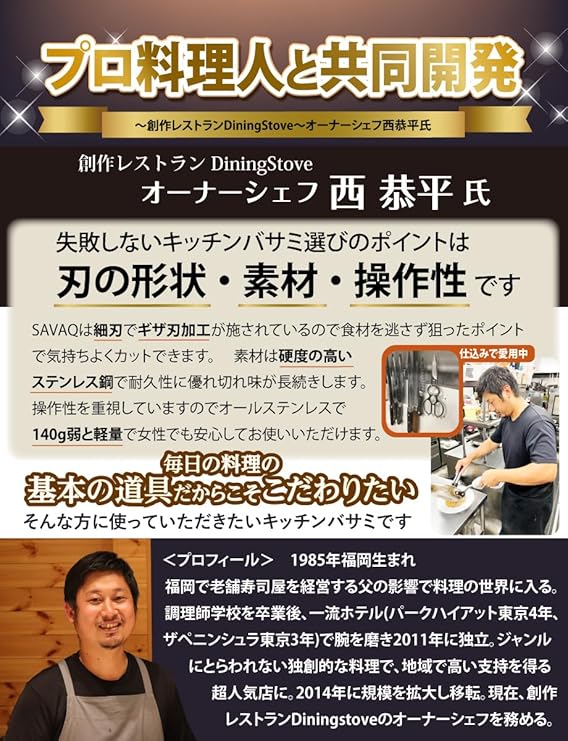 【プロ料理人との共同開発】 SAVAQは金型から作成したナイトライズ独自のオリジナルキッチンバサミです。 納得のいく質感に仕上がるまでステンレス一体成形の金型を何度も作り直し、開発に1年かけて完成しました。※デザインや形状、商品画像を似せて販売している模倣品が急増しています。 品質が著しく劣っている可能性がございますのでご注意ください。