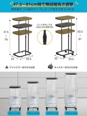 【便利なゴミ袋ホルダー仕様】 アジャスター付きサイズ:約33.5×22×(47.5~78)cm/キャスター付きサイズ:約33.5×22×(50.5~81)cm ◎重量:約2.2kg ◎材質:スチール(紛体塗装)対応ゴミ袋:20L~90L。ペットボトルや空き缶などの分別に便利なポリ袋ホルダー。