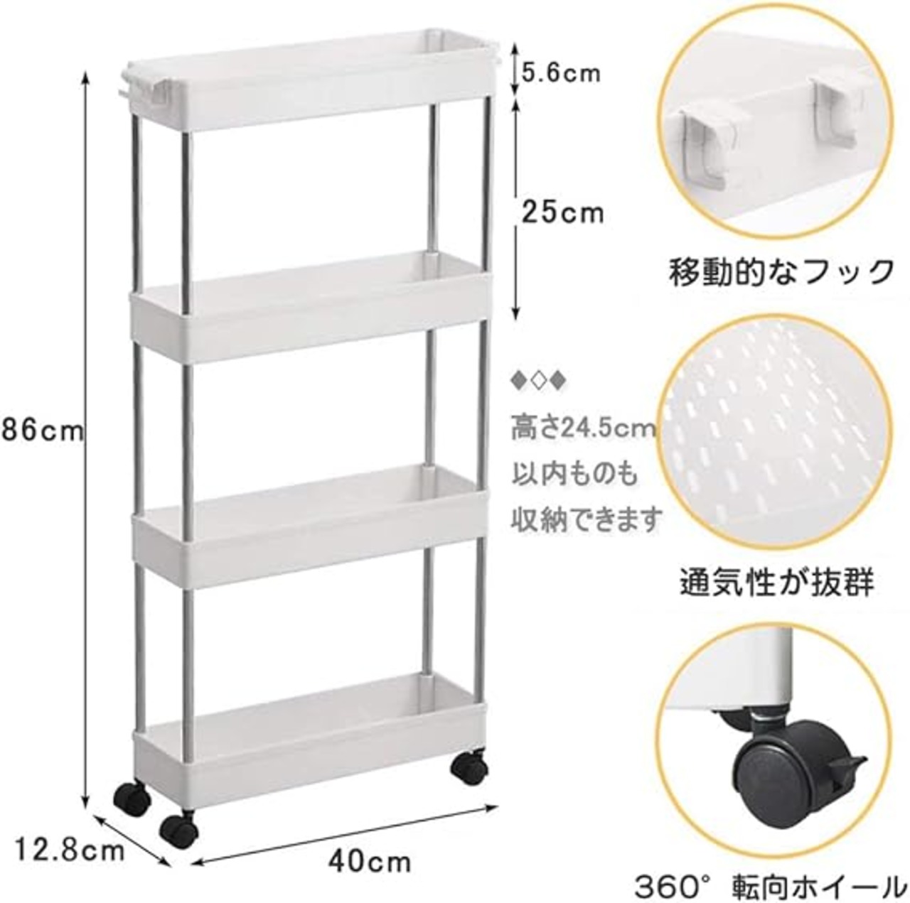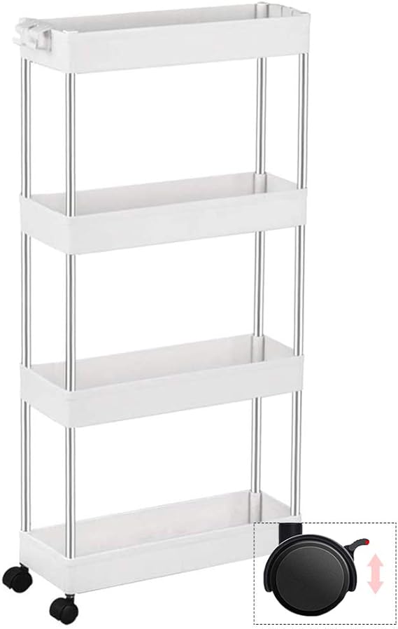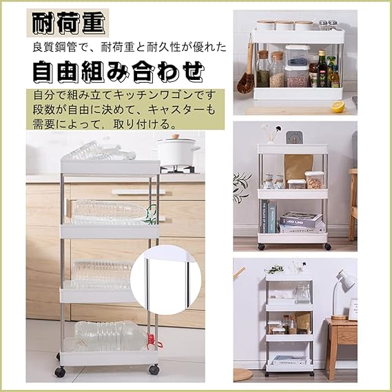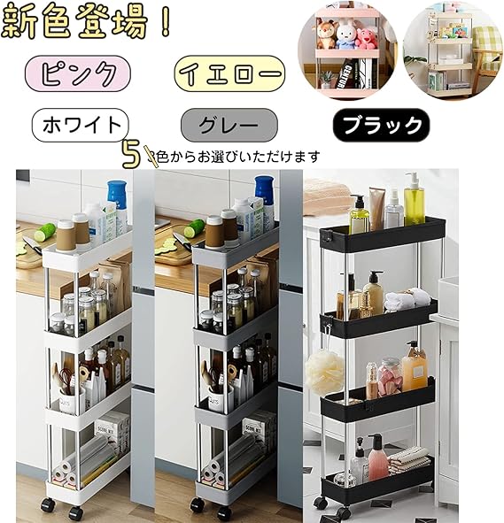 【シンプルで実用的、シーンを選ばないワゴン・カート】 細身設計の収納ラックは、部屋、キッチン、ランドリー、脱衣所、冷蔵庫、洗濯機や洗面台などの場所での使用に最適で、省スペースで、隙間を活用することができます。製品材質:ステンレス+ABS。耐久性のあるプラスチック素材で作られており、軽量で移動しやすいです。壁や隙間に寄りかからない場合、安定性を高めるために、洗剤などの重いものを下に置くことをオススメいたします。カゴはメッシュ状なので、通気性・排水性が良く、汚れが落ちやすくカビの発生も防ぐことができ