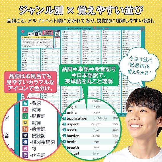 英検2級に必要な語彙を厳選収録: ポスターには、英検2級合格に必要な単語を1000語厳選して収録しています。頻出語や試験に出やすい表現が中心で、効率的な語彙力アップが可能です。