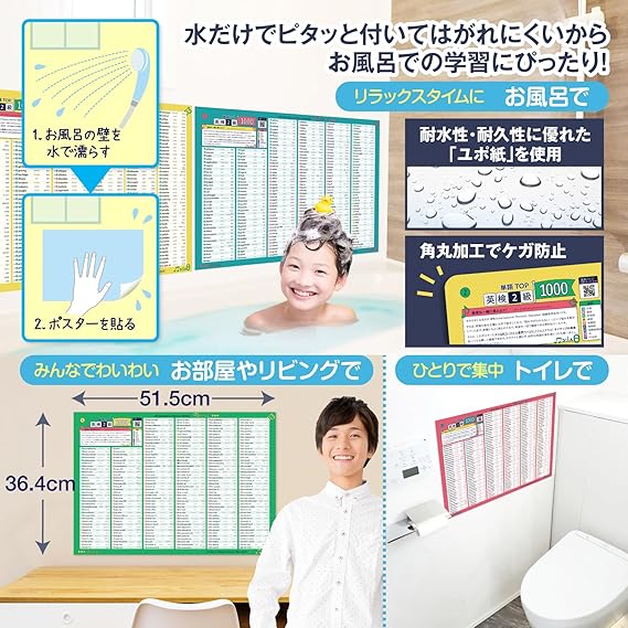 お風呂の学校 英検2級の英単語まとめ お風呂ポスター 4枚セット 音声付き 1000単語収録 B3サイズ 日本製 受験 英検 英語 英会話 防水 耐水 学習 a