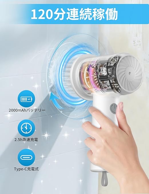 【Amazon.co.jp 限定】IYGLKD バスポリッシャー 電動お掃除ブラシ コードレス お風呂掃除 ブラシ 2000mAh大容量バッテリー 6 種類の交換ブラシ 2つ回転モード 120分間連続使用 IPX7 防水 USB C充電式 電動ブラシ トイレ掃除 軽量 浴槽・床・キッチン・車・壁掃除用 年末掃除 日本語説明書付属 a
