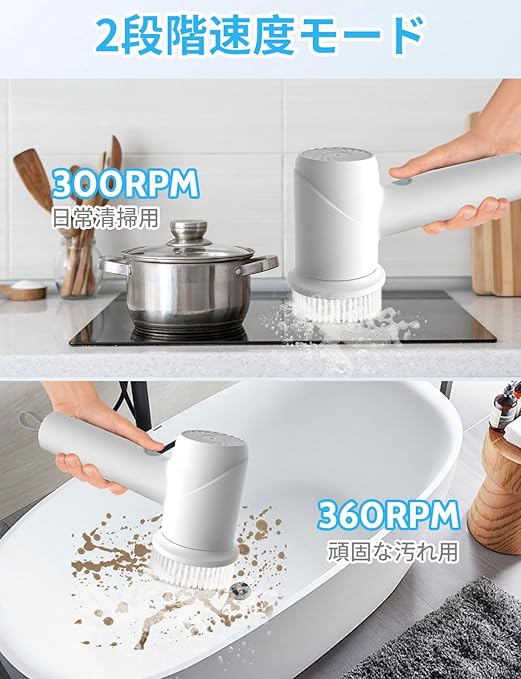 【高速モードと低速モード】お風呂掃除 ブラシは2つの回転モードを搭載。300rpm(低速):日常のホコリや軽い汚れに最適。400rpm(高速):頑固な油汚れや深層汚れを徹底除去。お掃除をラクラクに!