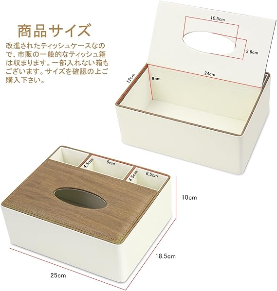 【商品規格】約24.5*18*10cm【ティッシュボックス部分】約24.5*13*10cm(内寸24*12*9cm)。改進されたティッシュケースなので、市販の一般的なティッシュ箱は収まります。一部入れない箱もございます。サイズを確認の上ご購入下さい。