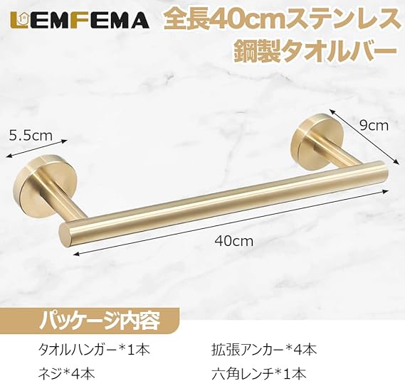 【商品仕様】:このタオル掛けの全長は約40cm、1本です。色:ゴールド。ネジサイズ:M4x30mm。(ネジ4本+プラスチック拡張パイプ4本+レンチ1本が付きます。)