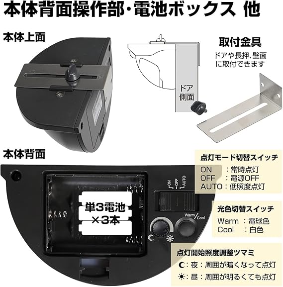 【明暗人感センサー】人に反応し、自動で点灯します。周囲の照度により点灯を調整できる明暗感度センサー調整機能付です。