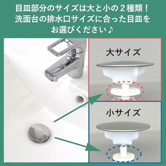 目皿は(大)(小)2種類同梱で、お使いの洗面台の排水口に合わせてご使用できます。