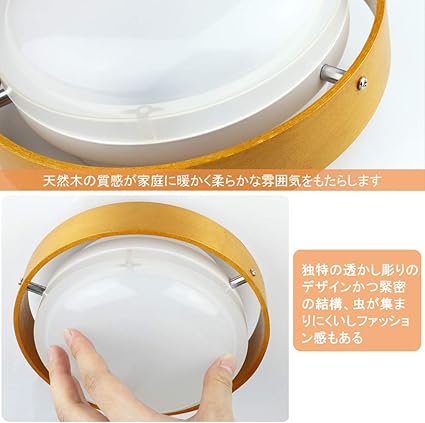 「サイズ」天井に取り付けて部屋を明るく照らす室内灯シーリングライトは軽い材質を採用しています。和風で優しい雰囲気を作り出すライト。直径約170mm x 高約さ60mm、フレ一ムは木目で軽い材質、和風で優しい雰囲気を作り出すライト、消費電圧:86−265V 周波数:50/60Hz。ルーメン:800 lm 工事不要と簡単取付