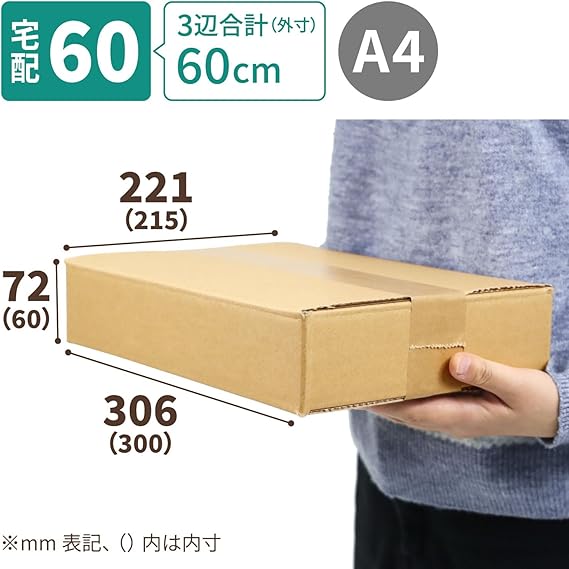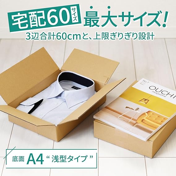 【A4用紙が入る宅配60サイズ箱】底面がA4用紙がきっちり収まる、3辺合計60cmの60サイズ対応ダンボール箱です。宅配60サイズの最大寸法のため、60サイズ、ギリギリまで荷物を詰めて送ることができます。