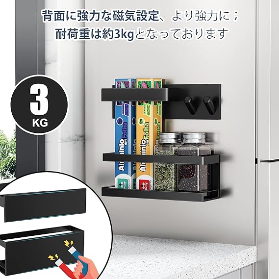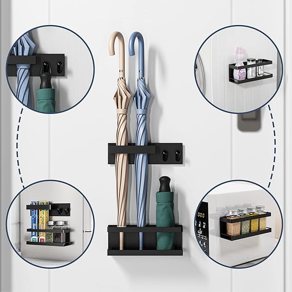 【幅広い使い道】:玄関に取り付けて傘やマスク、鍵などの収納ができることだけでなく、冷蔵庫や電子レンジの側面に取り付けて、スパイスボトルや調味料ボトル、飲み物などを収納するキッチン収納として利用することもできる。