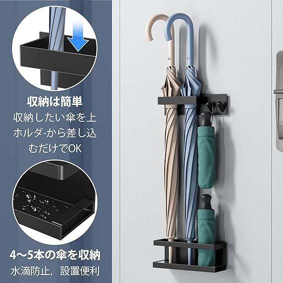 Bullthree 傘立て マグネット アンブレラスタンド 玄関収納 屋外収納 トレー付き 多機能傘収納 玄関の壁掛け式 ブラック a