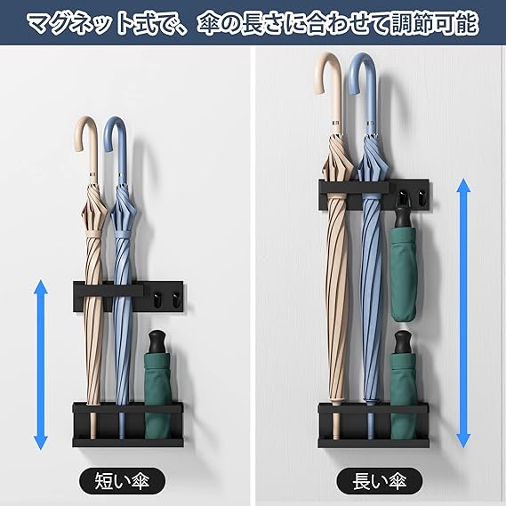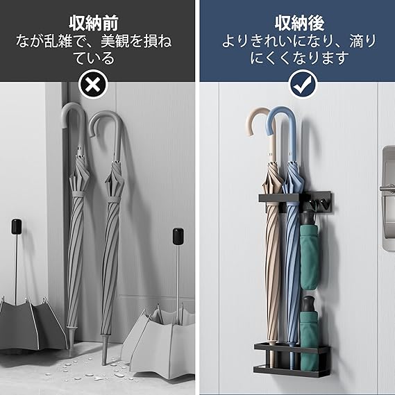 【取り付け簡単・防滴】:本製品は背面に磁石が付いたマグネット収納で、最大3kgまで収納でき、磁石が付けられる場所ならどこでも設置できる。傘立ての底にはトレイが付いており、床に水が垂れるのを防止、小物を整え、心地よい空間を創る。