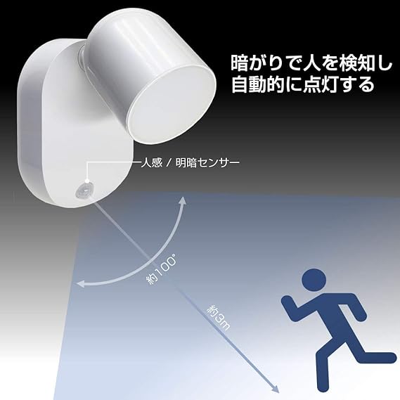 点灯保持時間:約12秒(人を検知すると自動で点灯し、約12秒後に自動で消灯します)点灯中に人を検知すると点灯時間が延長されます。 点灯開始照度:約1lx 使用温度範囲:10℃~40℃ 保護等級:ipx4(防沫形)