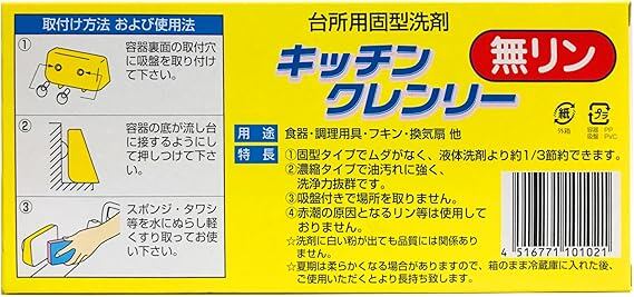 シンクにピタっ ! とくっつく便利な台所用固型洗剤 " キッチンクレンリー " は、昔ながらの手づくりの製法にこだわった【無リン・無香料・無着色・研磨剤不使用】の 濃縮固型タイプの食器洗い洗剤です。