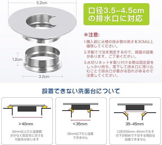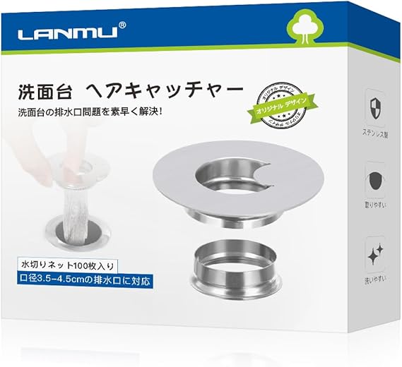LANMU 洗面台 ヘアキャッチャー 洗面台 排水口 ゴミ受け ステンレス製 口径3.5-4.5 cm 洗面所 排水口ネットホルダー 100枚 水切りネット付き 髪の毛キャッチャー 排水溝 掃除 特許出願 a