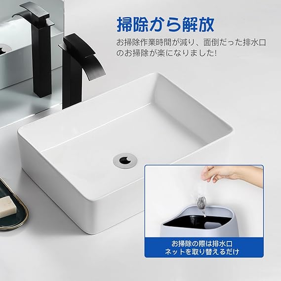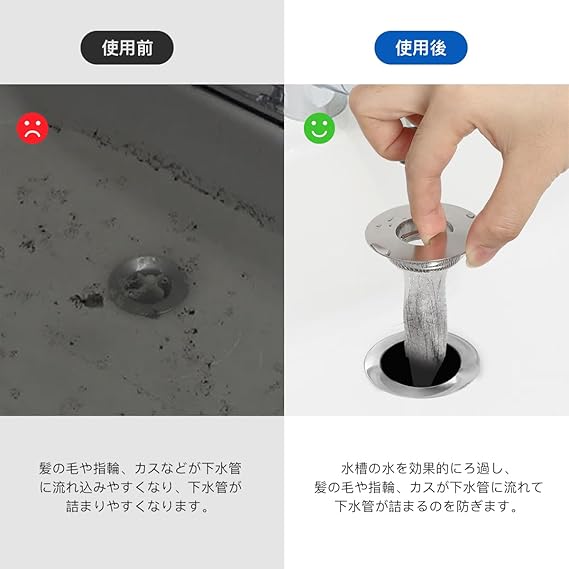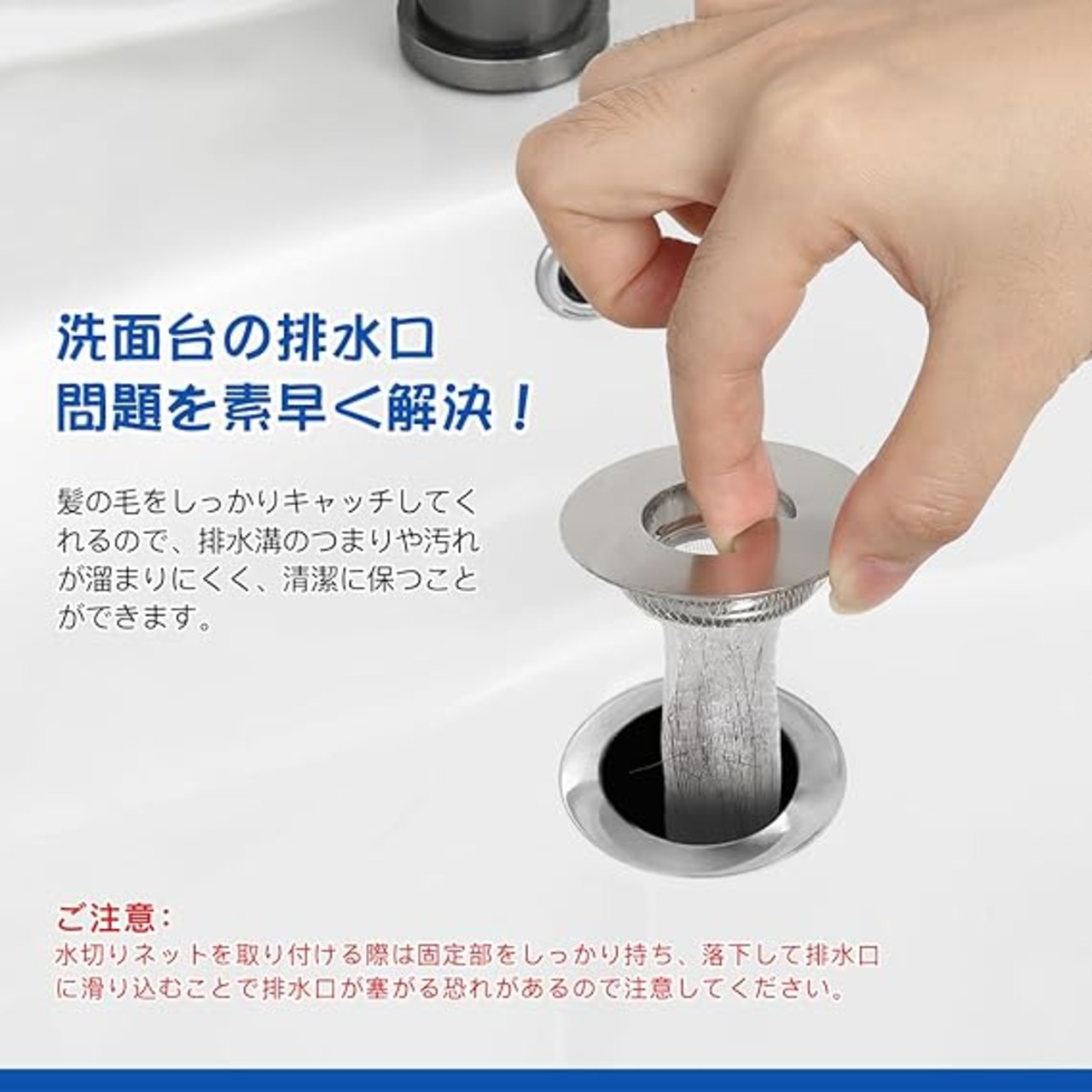 【掃除から解放】:髪の毛キャッチャーにネットを装着することで、洗面台の髪の毛や細かいゴミをしっかりキャッチします。お掃除の際はネットを取り替えるだけなので、掃除作業が減り、面倒だった排水口のお掃除が楽になりました!