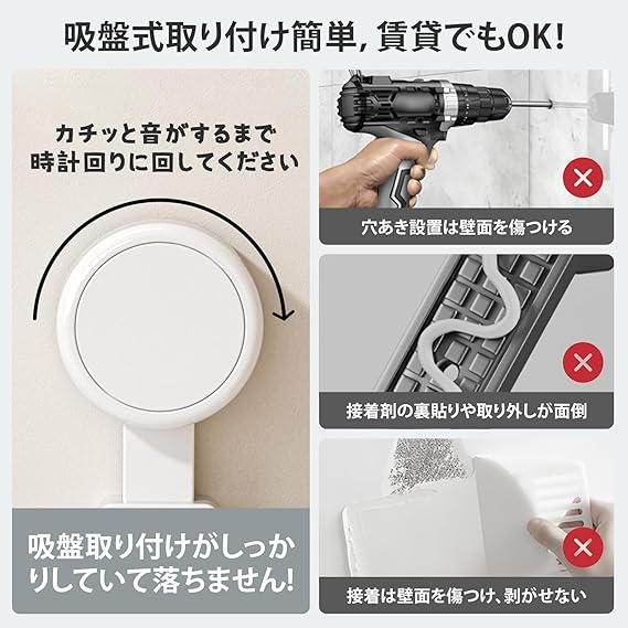 【吸盤式・浮かせて設置】Toski 洗面ゴミ箱はただのゴミ箱ではなく、吸盤で浮かせて付けられるのが大きな特徴。付属の吸盤を壁や鏡に設置したら、本体を差し込めばOK ! 鏡・吸盤より大きいタイル・透明ガラス・金属塗装面等の光沢のある平らな面であれば取り