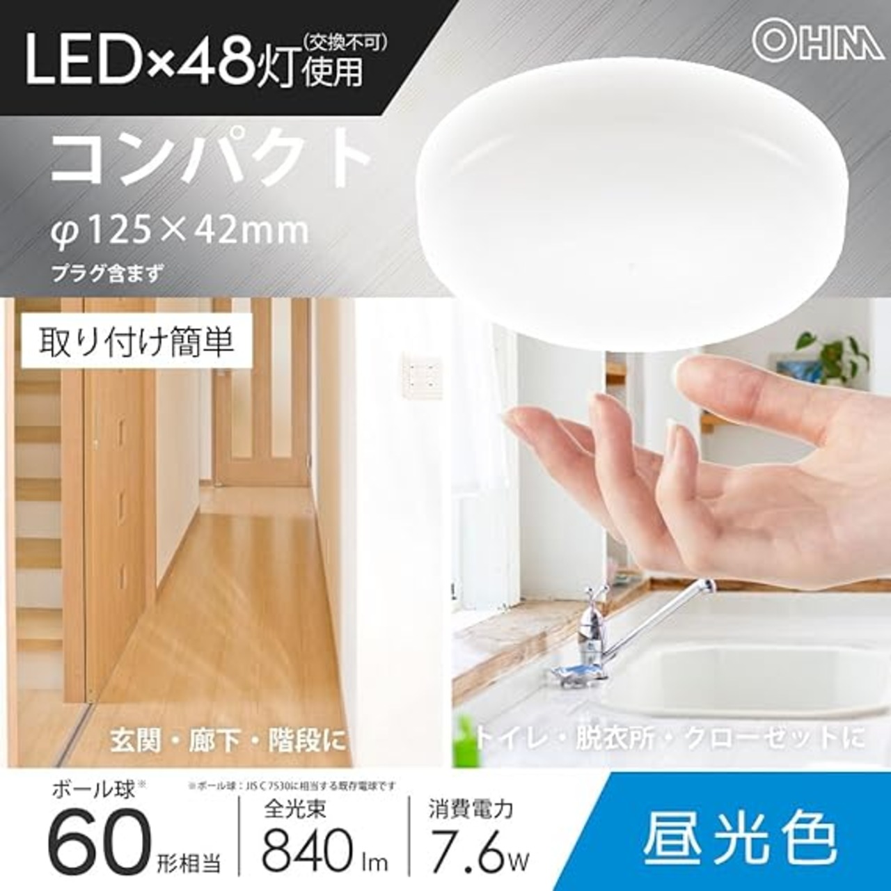 【 仕 様 】 ◆電源:AC100V 50/60Hz ◆消費電力:7.6W ◆使用光源:LED×48灯使用(交換不可)/昼光色 ◆全光束:840 lm ◆エネルギー消費効率:110.5 lm/W ◆平均演色評価数:Ra80