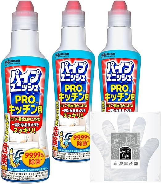 パイプユニッシュ プロ キッチン用 コバエ対策 ゴキブリ対策 液体 400g×3本 大容量 お掃除手袋つき キッチンクリーナー 排水口 排水溝 駆除 厨房 シンク 詰まり 洗浄 まとめ買い 【Amazon.co.jp 限定】 a
