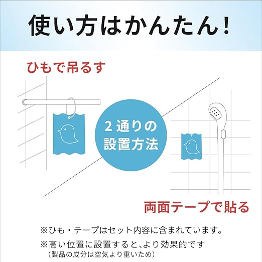 【使い方】使い方簡単。お風呂場に吊るすだけ。開封した瞬間から効果を発揮しますので、面倒な準備は必要ありません!水やお湯に濡れても効果
