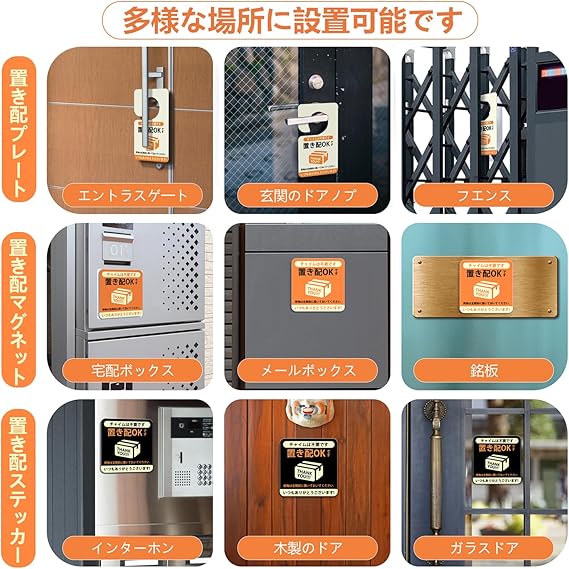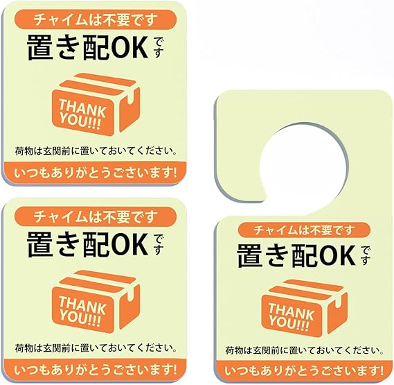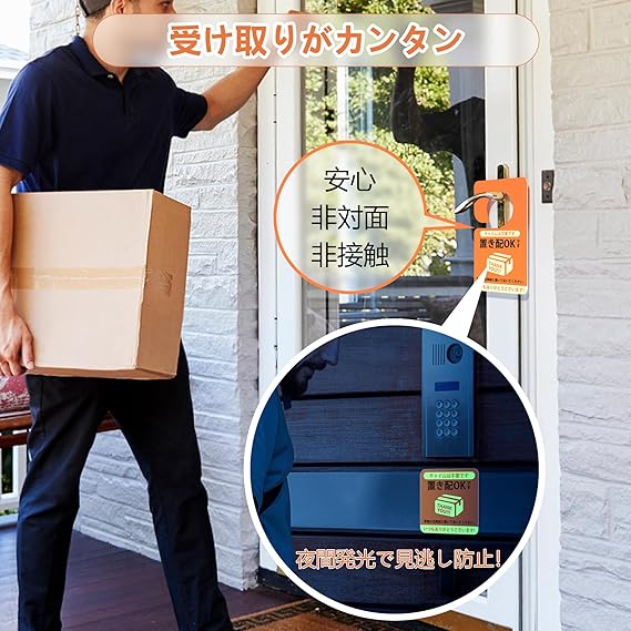 【他社製品よりコスパ抜群!】①改良・アップグレードされた3点セット(置き配マグネット×1、置き配ステッカー×1、置き配プレート×1)は、他社製品と比べてサイズが大きく、視認性が大幅に向上!②サイズ比較:置き配マグネット&ステッカー:約12cm×12cm(一般的な製品より約20%大型)、置き配プレート:約19cm×11.5cm(同類品より広い表示面)。③夜間も安心:蓄光材質を採用し、昼間の光を吸収すれば、夜間に長時間光ります。夜間の配達でも見逃しを防ぎます。