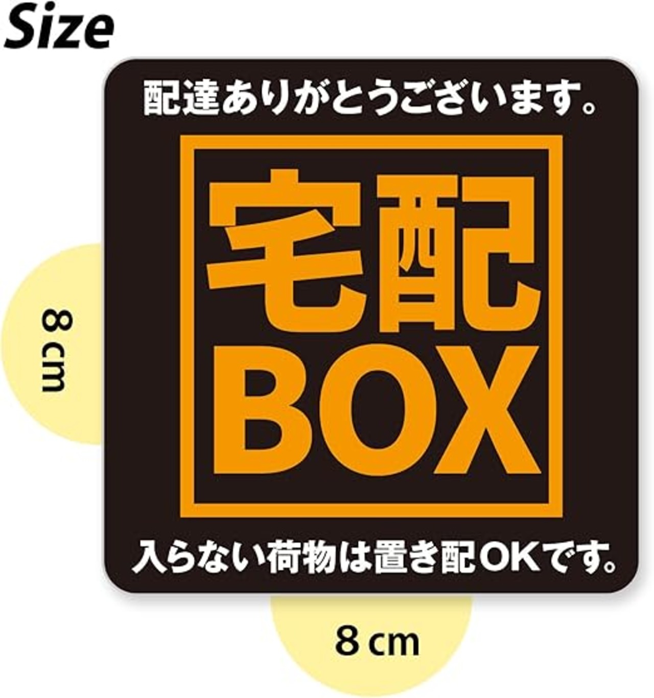 【サイズ・バリエーション】目を引くデザインの宅配ボックス用ステッカーです。約8×8cmの角丸ステッカー。1枚/2枚から選べる2種入り。カラーは以下の全5パターンをご用意:A(ホワイト×オレンジ)、B(オレンジ×ホワイト)、C(ホワイト×ブルー)、D(ブラック×オレンジ)、E(イエロー×ブラック)。設置場所や貼付物に合わせてお選びいただけます。
