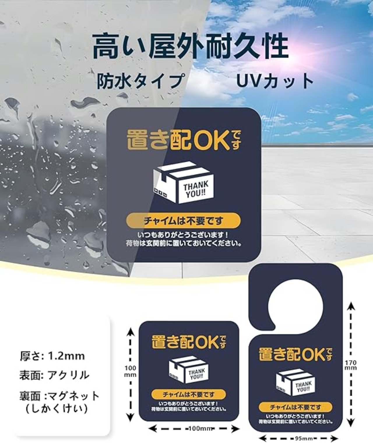 【超耐久性!】置き配ステッカーと置き配マグネットは、屋外での耐久年数が3~5年と長持ちし、UVカット加工で色あせ防止、防水・