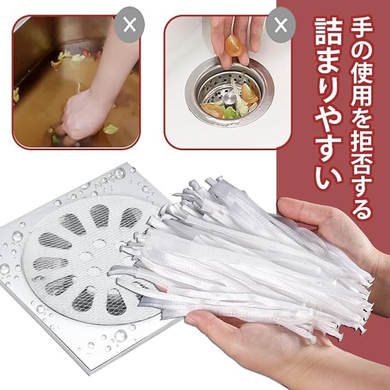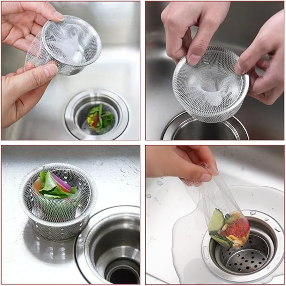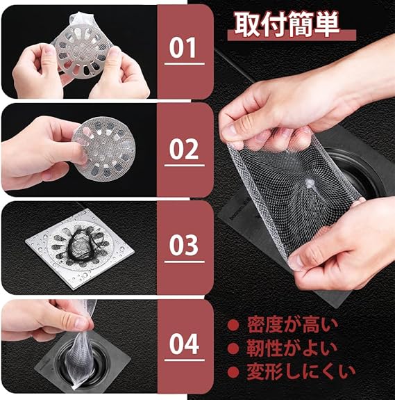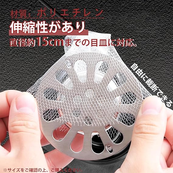 【簡単装着】シンクやバスルームの排水口にかぶせるだけの水切りネット。自在に伸びてフィットし、ゴミや髪の毛をキャッチして排水口を清潔に保ちます。