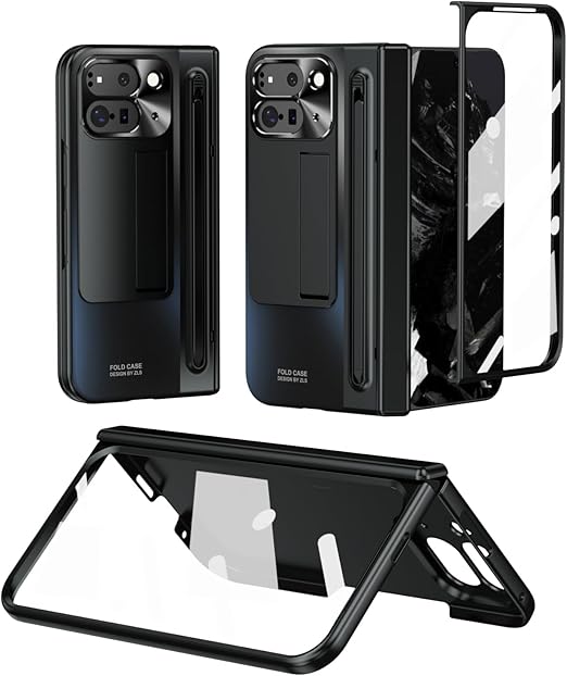 ケース Google Pixel 9 Pro Fold / 10 Pro Fold 薄型 軽量 携帯全面保護+強化ガラスフィルム+きんぞくラッカ+ペン 隠しスタンド機能 ヒンジ保護 ワイヤレス充電サポート メタルレンズカバー 携帯 手帳型,キラキラ QI 折り畳み おしゃれ 人気 かわいい フリップ 衝撃吸収 財布型 面白い 二層構造 取り外し - 黒 a