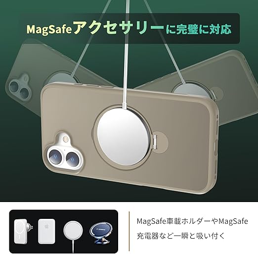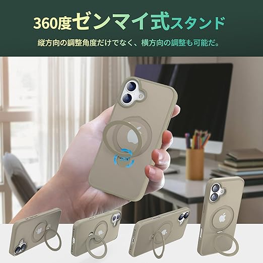 【定点360度回転スタンドとMagSafe兼用】新登場の iPhone 16 plus スタンドケースはユニークなマグネット環とリングスタンドの複合構造のデザインを採用しており、360°回転ベアリングで自由に動かせ、MagSafe充電中でも縦横スタンドが使用可能です。便利な隠れスタンドはケースと一体型になり、360°回転できる機能により、無段階調節で0°から120°までサポートで、横起きあるいは縦起きはもちろん、絶妙なデザインで携帯を自由に多角度を調節でき、 力よくスマホを支えて、映像や読書など