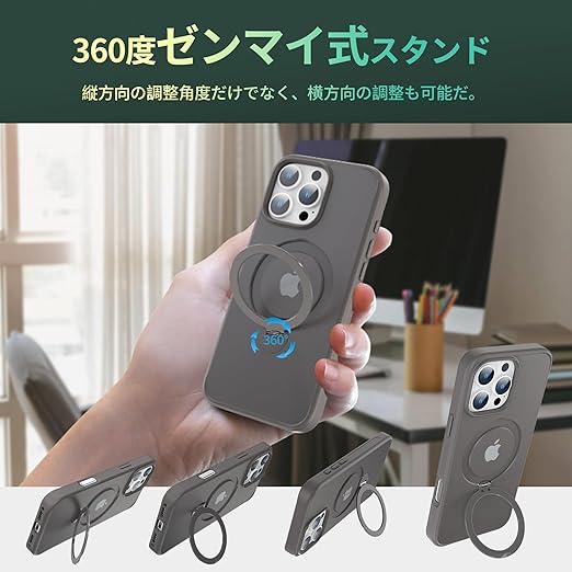 【定点360度回転スタンドとMagSafe兼用】新登場の iPhone 16 pro max スタンドケースはユニークなマグネット環とリングスタンドの複合構造のデザインを採用しており、360°回転ベアリングで自由に動かせ、MagSafe充電中でも縦横スタンドが使用可能です。便利な隠れスタンドはケースと一体型になり、360°回転できる機能により、無段階調節で0°から120°までサポートで、横起きあるいは縦起きはもちろん、絶妙なデザインで携帯を自由に多角度を調節でき、 力よくスマホを支えて、映像や読