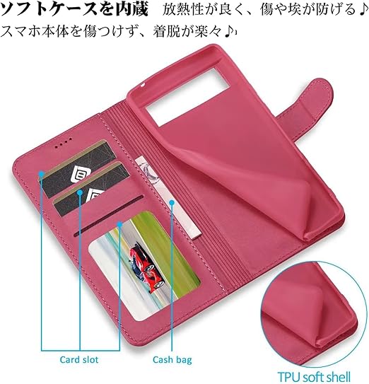 【耐衝撃性】耐熱性と柔軟性を誇る上質なPUレザーで作られ、手触り良い、落下時の衝撃を効率的よく吸収できるようにケースの各コナーの裏側が設計されています。丈夫でほど良い厚みで、落としてもスマホをきちんとお守れます。