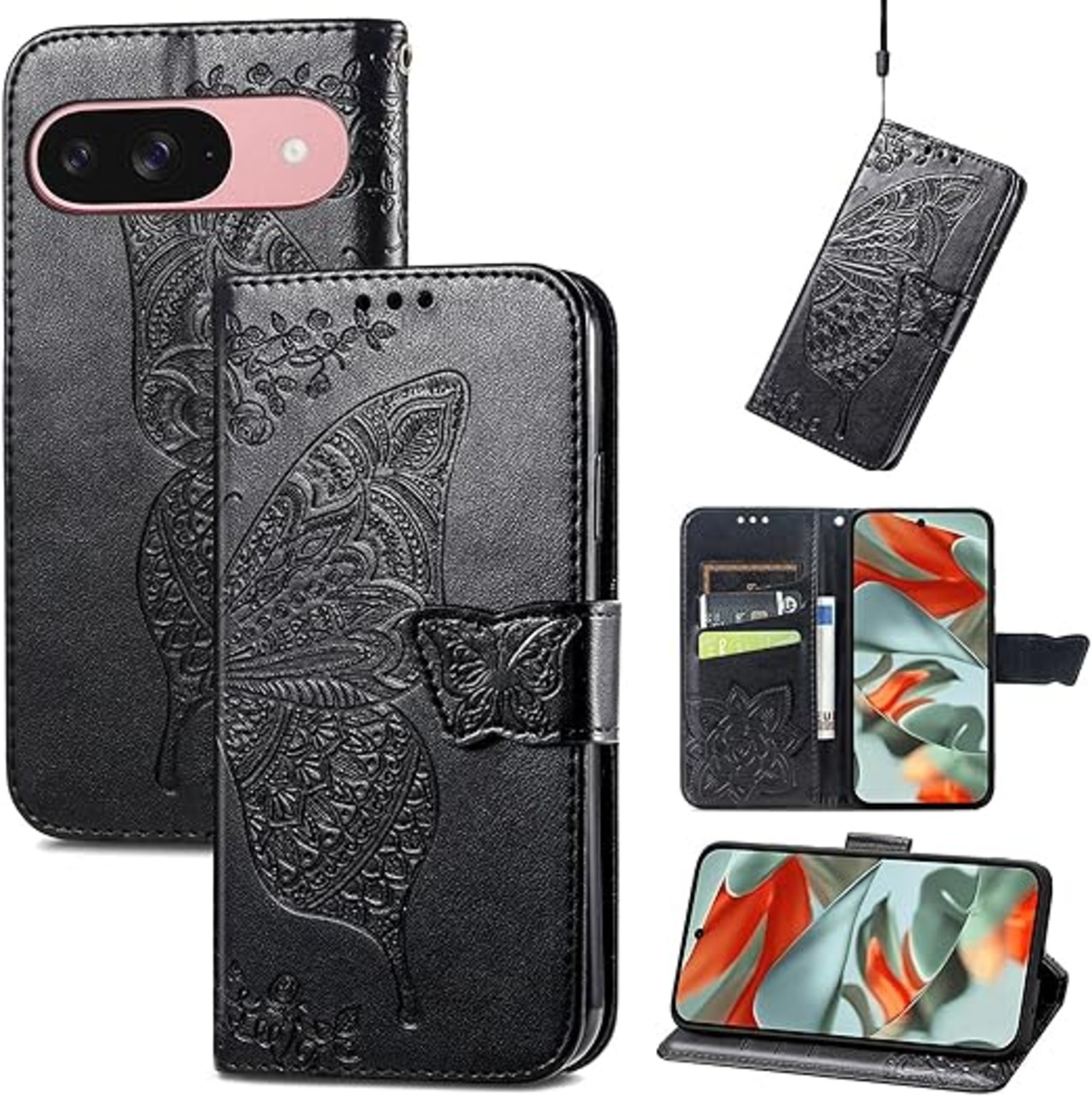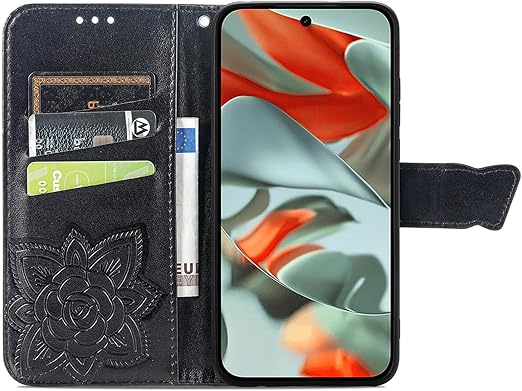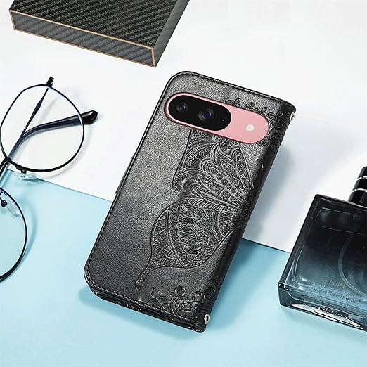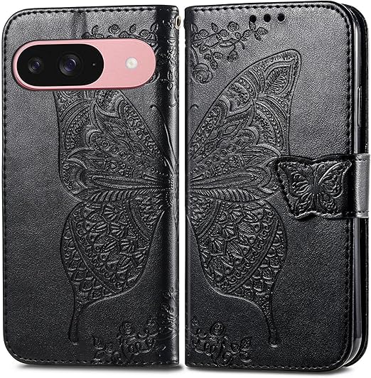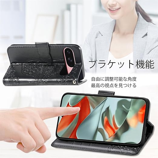 に適用するGoogle Pixel 10 ケース 手帳型 ノートブック型携帯電話保護カバー多機能携帯電話ホルスター財布携帯電話ホルダーバンプパターンテクスチャ耐久性摩擦耐性携帯電話ケース男性と女性に適した多色オプション (バタフライ黒) a