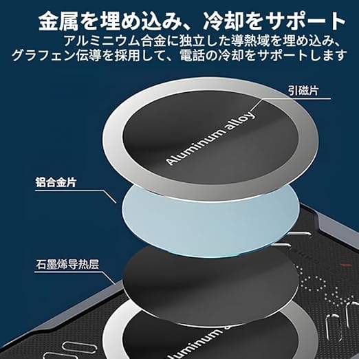 軍事規格の耐衝撃性: 放熱部は3層構造(アクリル補強板グラフェン熱伝導層+アルミ合金シート+グラフェン放熱層+磁性シート)を採用し、360度の衝撃吸収性を備えています。 1.2 メートルの落下テストに合格した耐衝撃設計で高価なデバイスを保護します。