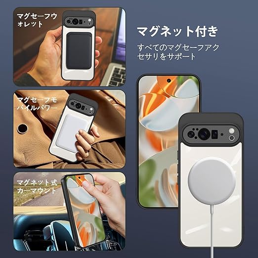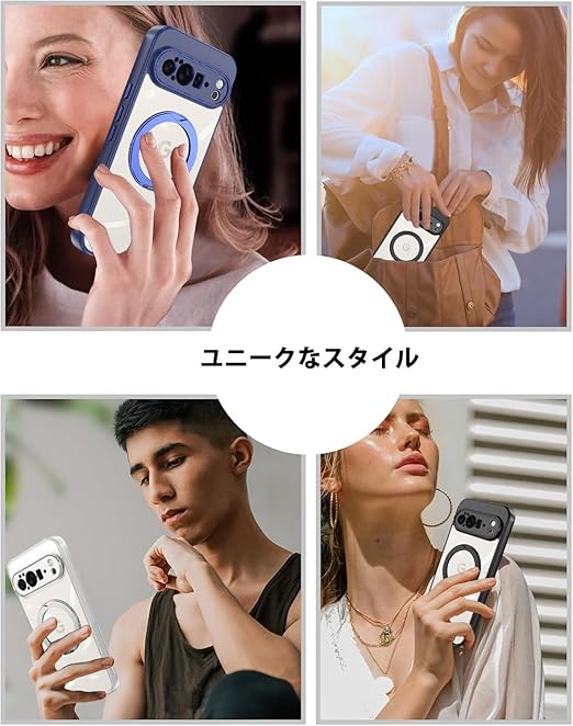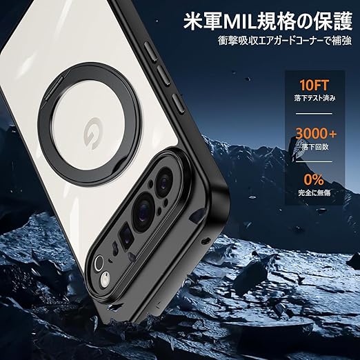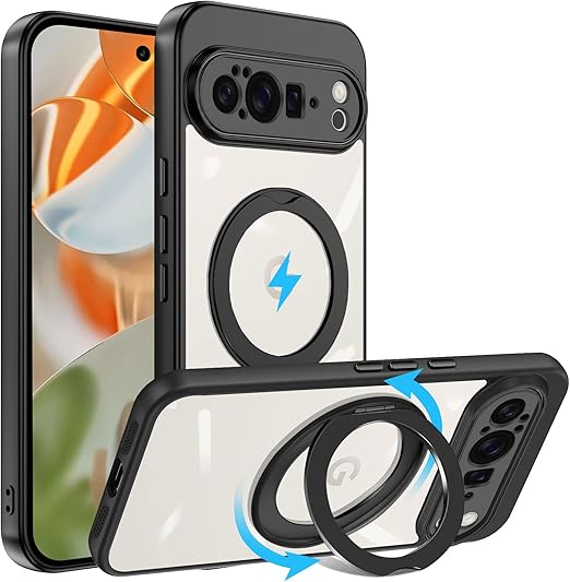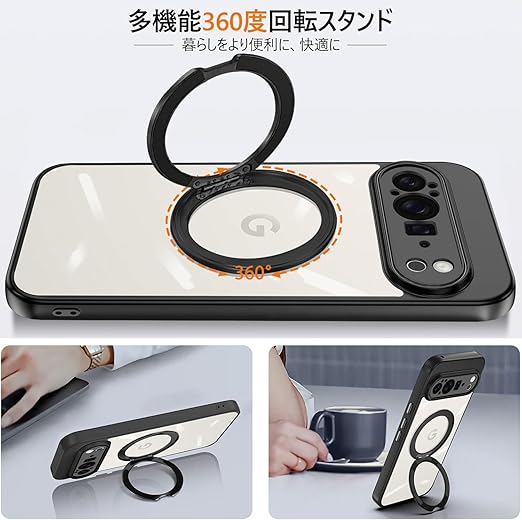 Google Pixel 10 Pro XL 用 ケース クリア カバー 360°回転スタンド 磁気対応 マグネット搭載 透明 リング マグネット ワイヤレス充電対応 スタンド機能 ピクセル 10pro xl 保護ケース 角度調整 滑り防止(ブラック) a