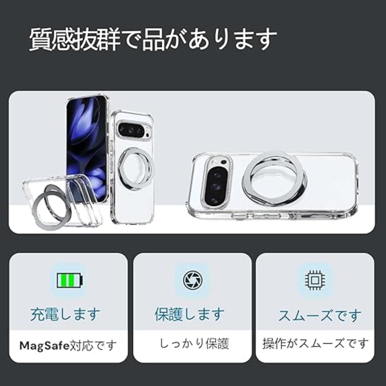 【対応機種】本製品はPixel 10 Pro XL 「6.8インチ」専用ケースです。Pixel 10 および Pixel 10 Pro (6.3インチ)とはサイズが異なるため、互換性はありません。ご購入の際は、お手持ちの機種名を必ずご確認ください。ケースを装着したまま、MagSafeアクセサリーやワイヤレス充電もスムーズに利用できます。製品保証に関しては、ご購入日より1ヶ月間、製造工程に起因する不具合が認められた場合、メーカー側の責任において新品との無償交換を実施いたします。製品の品質とお客様の