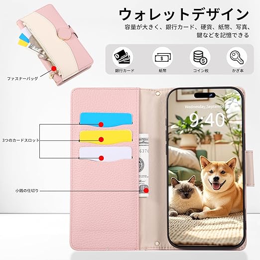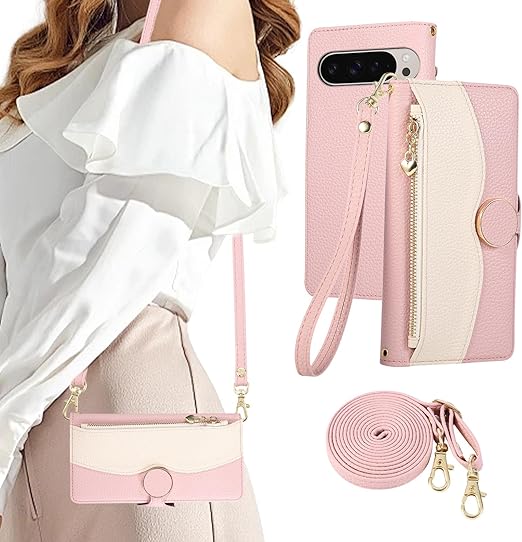 KW-LINK Google Pixel 10 Pro XL ケース 手帳型 ショルダー スマホケース グーグルピクセル10 pro XL ケース 手帳型 おしゃれ 2色パッチワーク 携帯カバー ピクセル10プロ X L カバー 小銭入れ カード収納 ジップ付き google pixel10 pro xl 手帳型ケース 肩掛け 斜め掛け ストラップ付き スタンド機能 可愛い 女性 贈り物-ピンク a