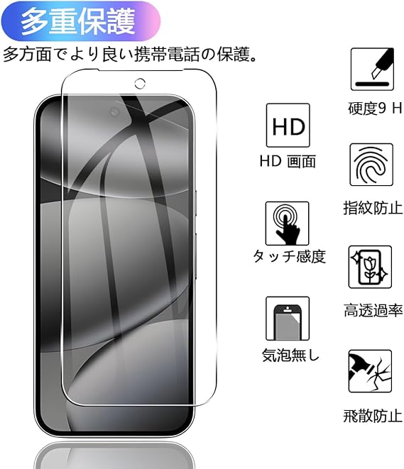 【対応機種 】 対応 google Pixel 10 Pro XL ガラスフィルム + カメラフィルム ,専用液晶画面保護ガラスフィルム。スクリーンプロ XLテクターに付属のマウントフレームを使用することで簡単に取り付けができ、フィルムのシリコン自己吸着層により、スチールフィルムを携帯電話に合わせて軽く置くだけで、気泡が入らないように簡単に取り付けられます。【指紋認証の設定手順】pixel10 Pro XL 保護フィルムを貼り付けた後、指紋を再入力する必要がございます。そうすれば、指紋認証とロッ