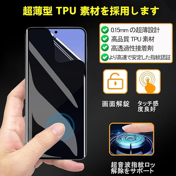 [ケースと干渉せず、指紋認証対応]弊社のフィルムは市販の多くの保護ケースと互換することができます。フィルムが貼り付けるとスマホ周辺が小さいなスペースが保留するデザインのため様々なケースに干渉ぜず、貼っても貼っていないようなクリア感があります。本製品は弾力性と柔軟性に優れているTPU素材を採用し、