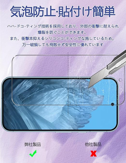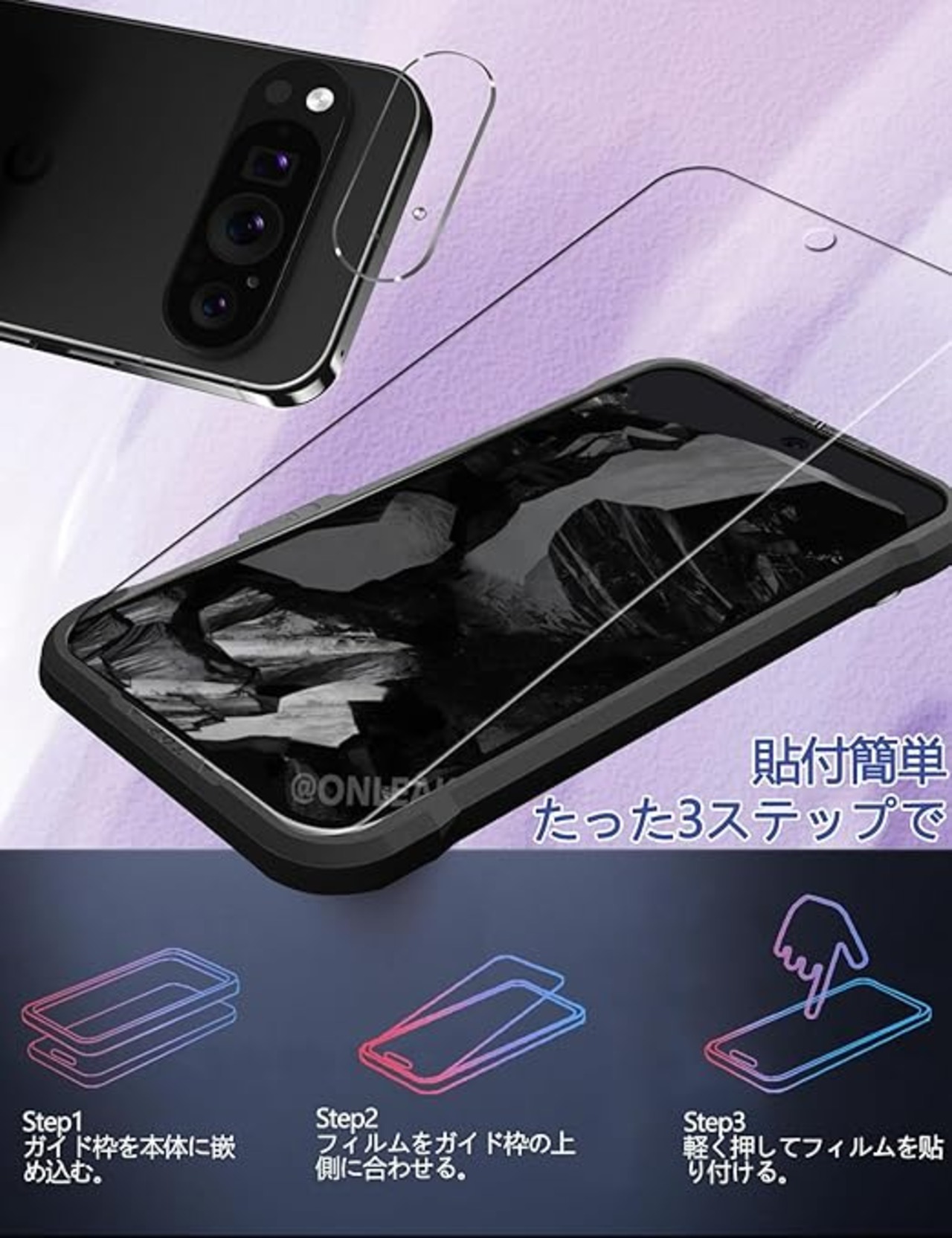 【ガイド枠】Pixel 9 Pro XL ガイド枠が付属しているため、貼り付け時に保護フィルムの位置決めが簡単で、ズレることもありません。