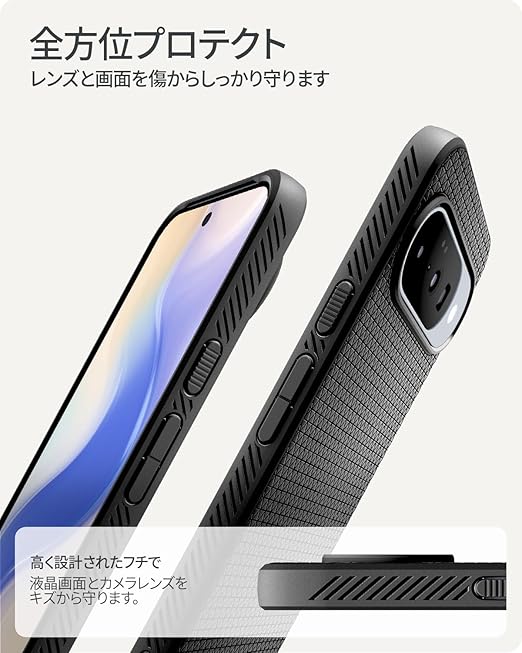 【高耐久のマット素材】マットな仕上げとジオメトリックなパターンが魅力的なリキッド・エア。装脱着が簡単になる柔らかいTPU(熱可塑性ポリウレタン)素材に衝撃を吸収するエアクッションを適用し、極めた保護力でデバイスを守ります