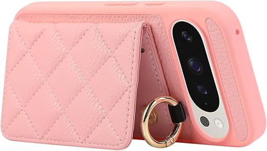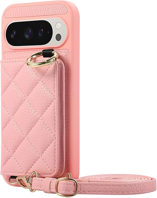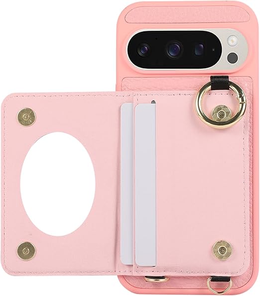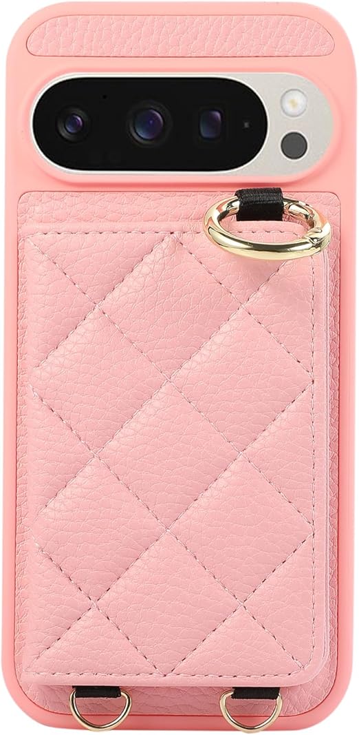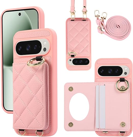 Succtopy Google Pixel 10 Pro XL ケース 手帳型 ショルダー スマホケース ピクセル10プロ XL ケース 手帳型 鏡付き 肩がけ 首掛け 斜め掛け ストラップ着脱可 財布付き リング付き 可愛いチェック柄 カバー マグネット内臓式 カード収納 携帯カバー(ピンク) a